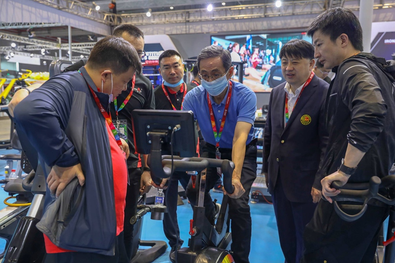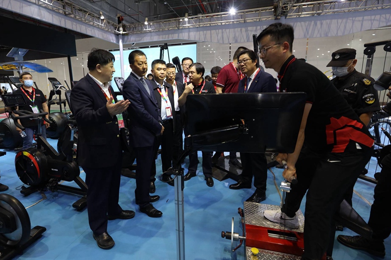 展會(huì)期間,國(guó)家體育總局副局長(zhǎng)李穎川、總局經(jīng)濟(jì)司司長(zhǎng)劉扶民和中國(guó)體育用品業(yè)聯(lián)合會(huì)主席李樺等領(lǐng)導(dǎo),在黃承斌董事長(zhǎng)的陪同下蒞臨鐵人體育展位參觀指導(dǎo),對(duì)鐵人體育智能化健身器材給予肯定。李穎川副局長(zhǎng)重點(diǎn)關(guān)注了競(jìng)技訓(xùn)練器材,駐足察看體能教練的使用演示,表示傳統(tǒng)健身器材廠商從全民健身領(lǐng)域拓展到專業(yè)競(jìng)技體育訓(xùn)練器材的研發(fā)生產(chǎn),是一次很好的嘗試和突破,對(duì)企業(yè)創(chuàng)新發(fā)展和健身器材制造業(yè)提檔升級(jí)高質(zhì)量發(fā)展都具有積極意義。黃承斌董事長(zhǎng)對(duì)領(lǐng)導(dǎo)們的關(guān)心指導(dǎo)表示衷心感謝,并向領(lǐng)導(dǎo)們介紹了本屆體博會(huì)鐵人體育的參展情況。