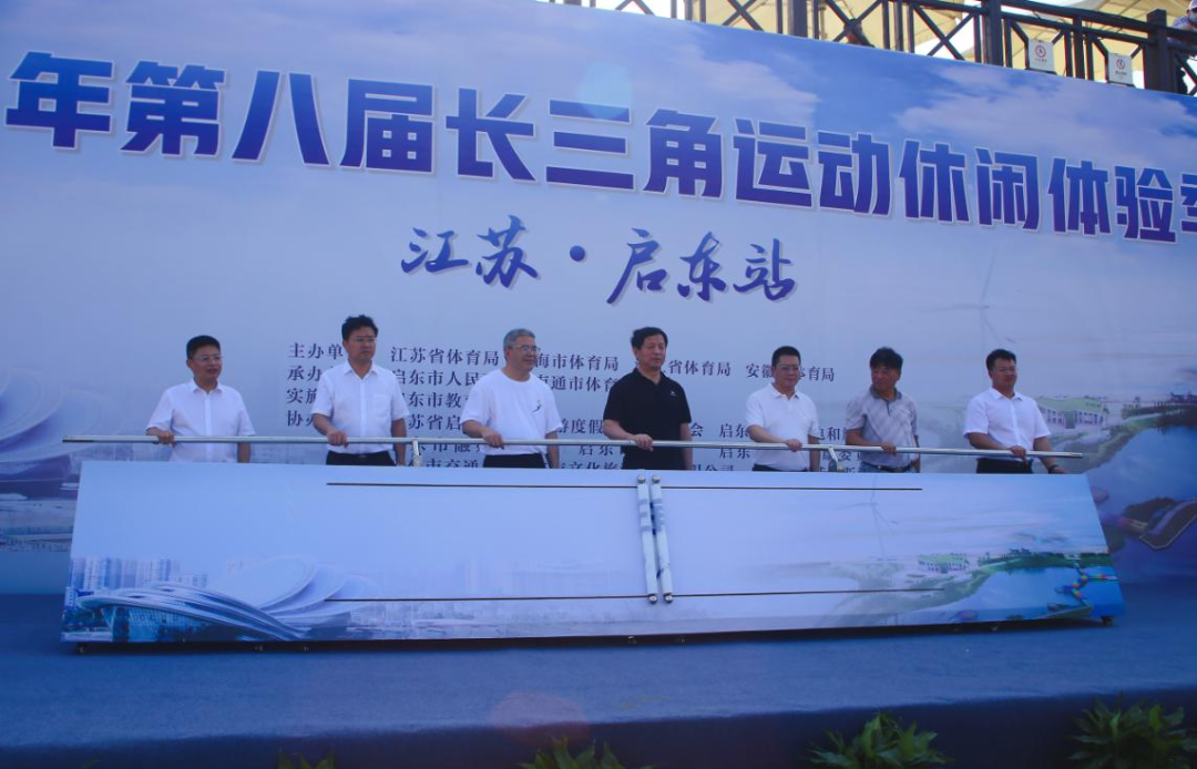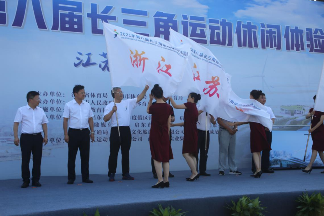 授旗儀式和啟動(dòng)儀式在熱烈的掌聲和歡呼聲中進(jìn)行,七位領(lǐng)導(dǎo)手握啟動(dòng)桿,共同啟動(dòng)裝置, 一起開(kāi)啟長(zhǎng)三角體育運(yùn)動(dòng)休閑領(lǐng)域的美好未來(lái)。