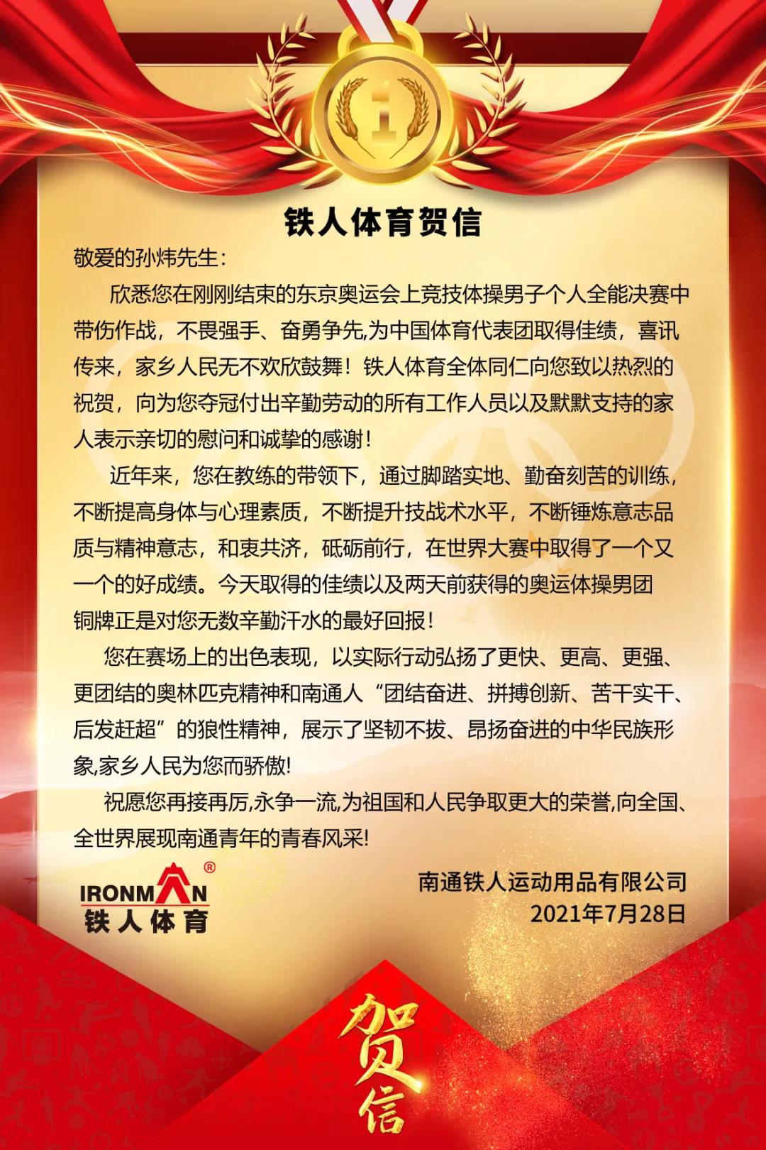 東京奧運(yùn)會(huì)體操項(xiàng)目男子全能決賽于當(dāng)?shù)貢r(shí)間28日結(jié)束,南通健兒孫煒以87.798獲得第四名的佳績(jī)。中國(guó)選手肖若騰以88.065分獲得銀牌遺憾失金。鐵人體育第一時(shí)間向?qū)O煒先生發(fā)出了賀信,感謝他為國(guó)家的榮譽(yù)付出的努力,向他團(tuán)隊(duì)所有工作人員以及默默支持的家人致以親切的慰問(wèn)和崇高的敬意!