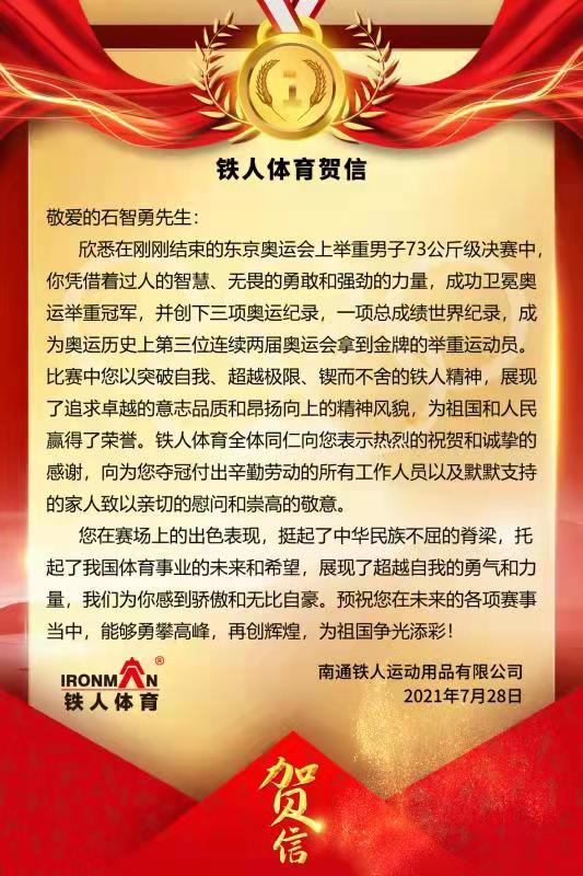 石智勇作為鐵人體育品牌代言人,雙方一直保持著良好合作關(guān)系,此次比賽他也身著鐵人服裝展示了鍥而不舍的鐵人精神,鐵人時刻關(guān)注著石智勇的比賽動向,組織員工收看比賽,在得知奪冠后,第一時間發(fā)去賀信,感謝他為國家的榮譽(yù)付出的努力,向他團(tuán)隊所有工作人員以及默默支持的家人致以親切的慰問和崇高的敬意!